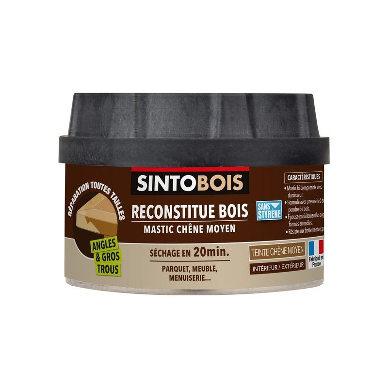 Conditionnement : 1 pot(s) de 580 gramme(s), Température minimum : 10 °C, Temps de formation de peau : 20 minute(s), Température maximum : 30 °C, Classement de résistance au feu : Non, Matériau support : Bois et dérivés, Mode de pose : Manuelle, Base chimique : Polyester, Possibilté de peindre sur le mastic : Oui, Lieu de pose : Intérieur et extérieur, Application : Bâtiment, Couleur : Chêne moyen, Contenance : 580 g