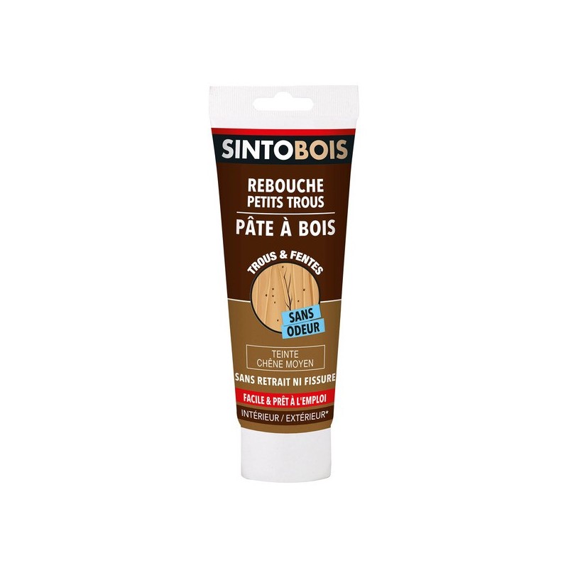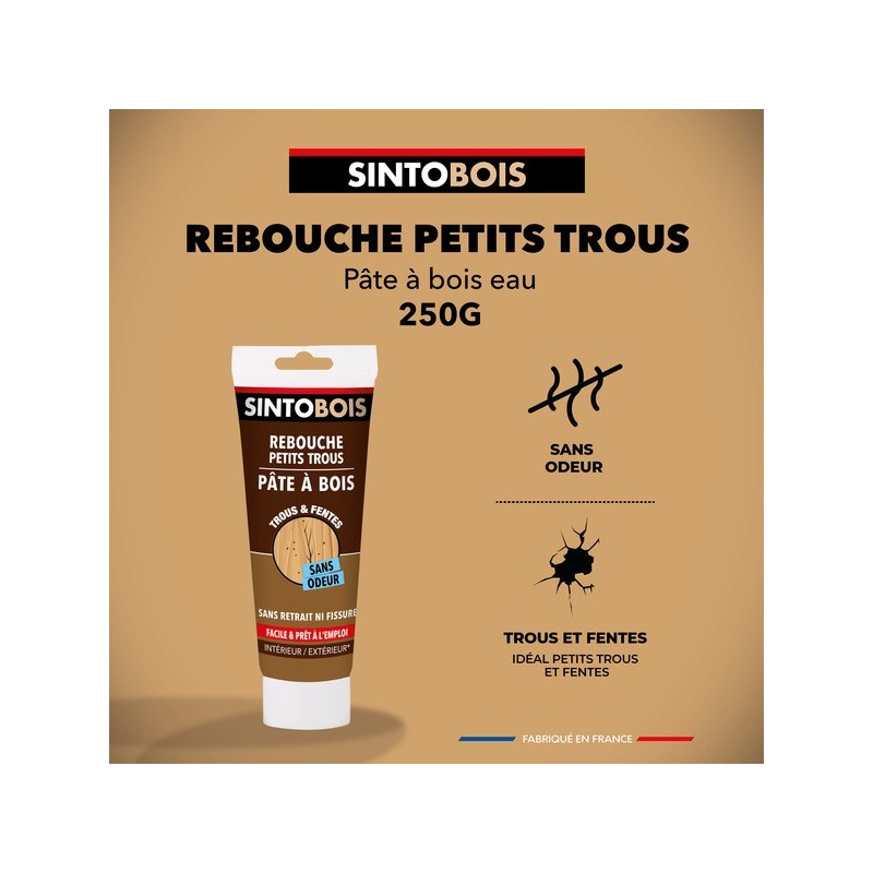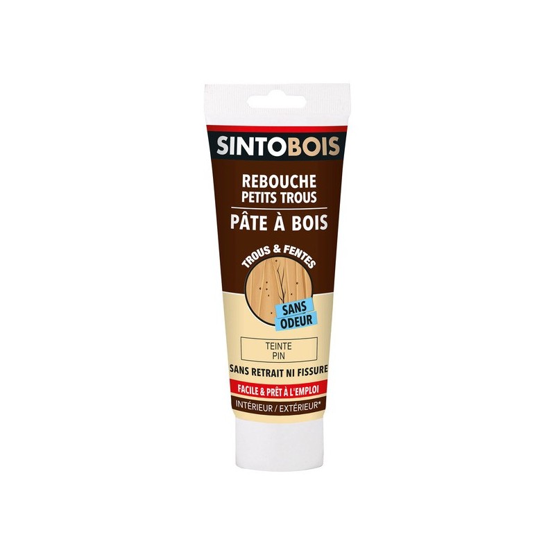 La pâte à bois "Rebouche imperfections" SINTOBOIS répare les fissures et trous de vers ou de clous sur les mobiliers en bois, les portes, les fenêtres, les escaliers... que ce soit à l'intérieur ou à l'extérieur.